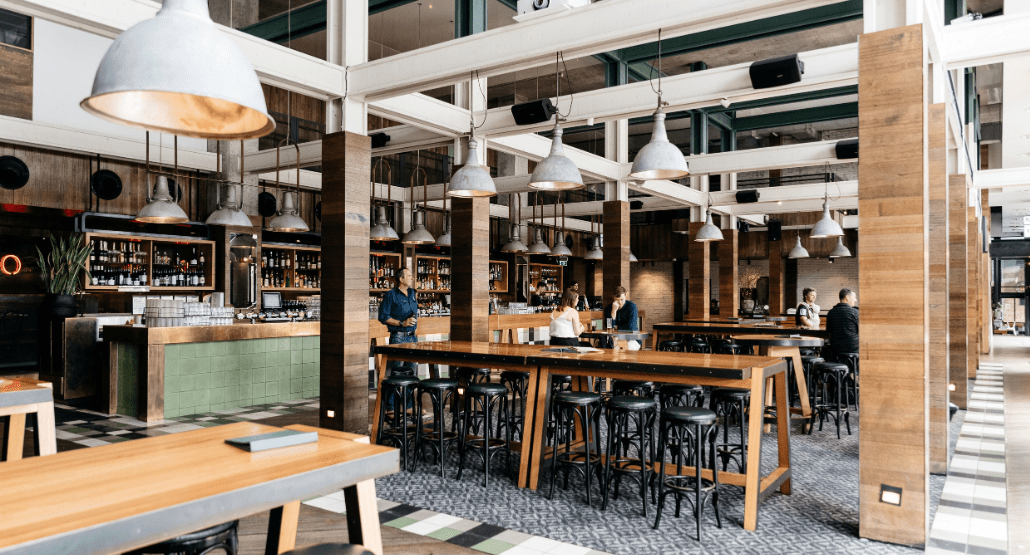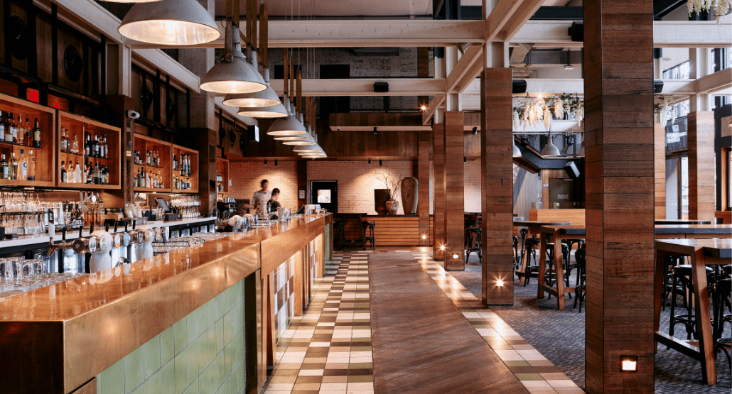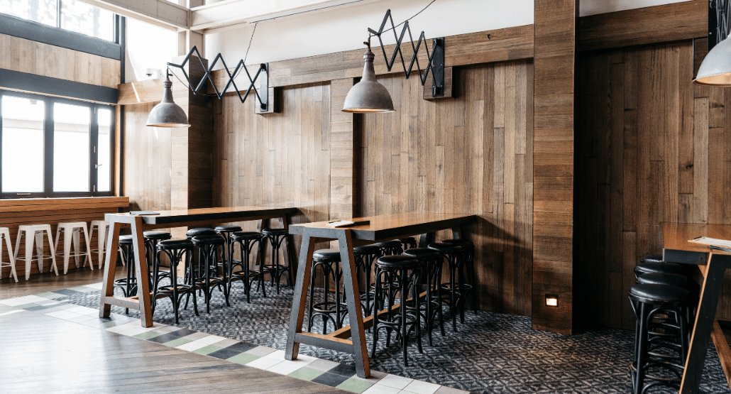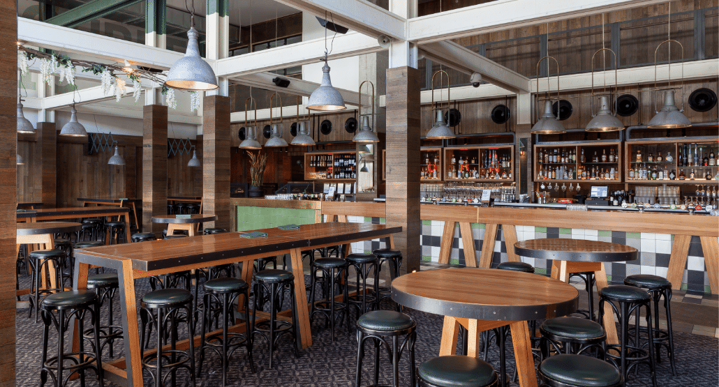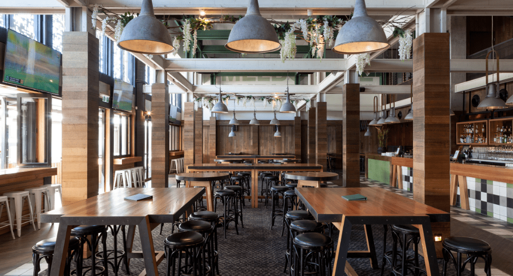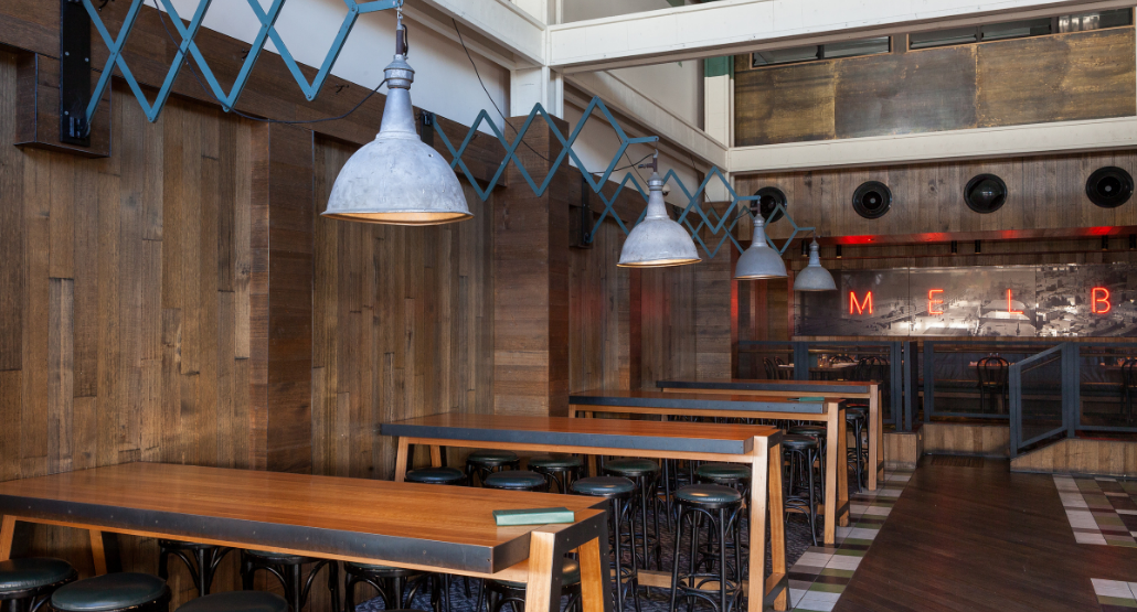 This dynamic area sees the iconic industrial flair of Melbourne Public injected into the décor, boasting striking industrial light fittings, exposed beams and high bar tables and stools.