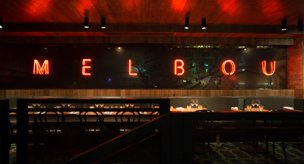 With banquette seating, the signature neon ‘Melbourne Public’ sign, along with fleeting glimpses of the lively main bar, creates an intimate but atmospheric ambience.
